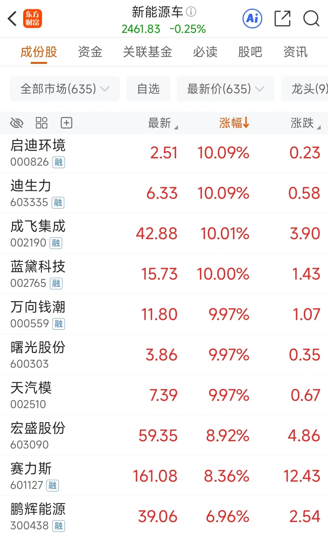 受赛力斯带动,9月26日早盘新能源车板块相对强势,板块中迪生力、启迪环境、成飞集成、蓝黛科技、万向钱潮、天汽模、曙光股份纷纷涨停。宏盛股份、鹏辉能源、美晨科技、英利汽车等也涨幅靠前。