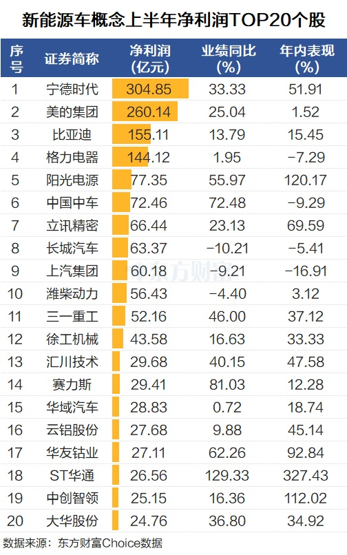 部分行业龙头股上半年业绩表现亮眼。宁德时代上半年归母净利润为304.85亿元,同比增长33.33%。比亚迪上半年归母净利润155.11亿元,同比增长13.79%。赛力斯上半年归母净利润29.41亿元,同比增长81.03%。