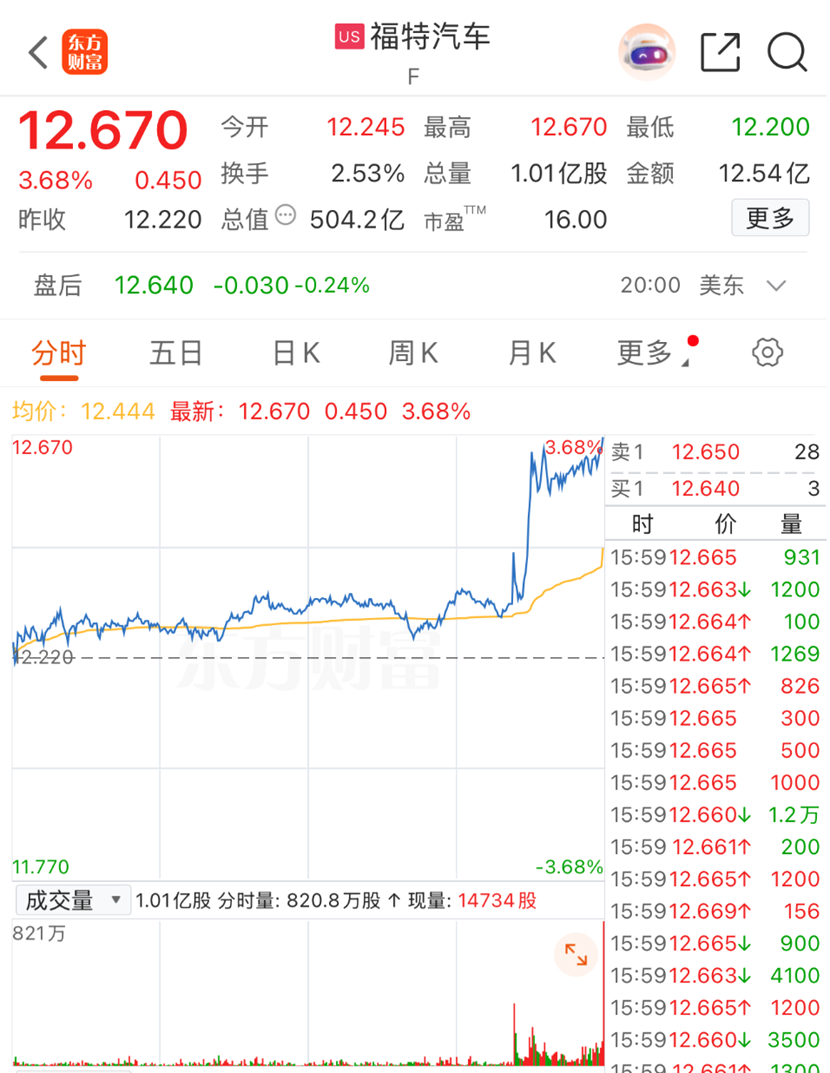 受上述消息刺激,汽车制造商股价在美股尾盘集体拉升,截至收盘,福特汽车大涨3.68%,克莱斯勒母公司Stellantis大涨3.17%,通用汽车涨1.3%。