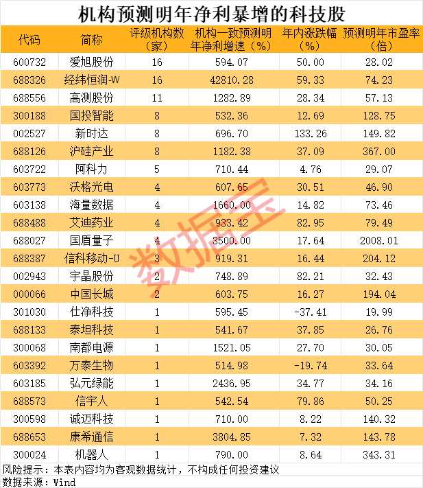 未来业绩能否兑现或许是决定这些科技股能否持续强势的关键。相对来说,机构关注度越高的个股,实现业绩的可能性或许更大。其中,经纬恒润-W、爱旭股份、高测股份均有10家以上机构预测明年业绩。另外,根据机构一致预测明年净利计算,仕净科技、泰坦科技、爱旭股份、阿科力市盈率均不足30倍。