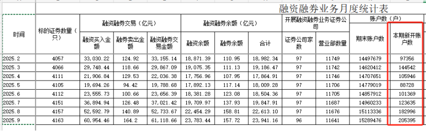 从两融账户月度账户数据变化来看,2025年1月新开账户数7万户;2月新开9.73万户;3月新开14.45万户;4月新开10.59万户;5月新开8.87万户;6月新开10.14万户;7月新开12.36万户;到8月新开18.3万户,9月新开户20.54万户。