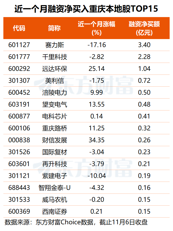 资金面上,重庆本地股中,近一个月融资净买入超1亿元的个股有3只,分别为赛力斯、千里科技、远达环保,美利信也获杠杆资金加仓逾7000万元。