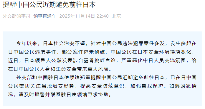 今年以来,日本社会治安不靖,针对中国公民违法犯罪案件多发,发生多起在日中国公民遇袭事件,部分案件迄未侦破,中国公民在日本安全环境持续恶化。近日,日本领导人公然发表涉台露骨挑衅言论,严重恶化中日人员交流氛围,给在日中国公民人身和生命安全带来重大风险。