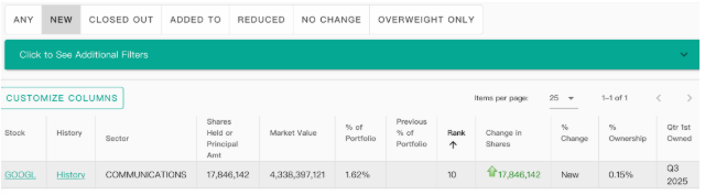 据披露,伯克希尔在第三季度建仓谷歌-A(GOOGL),买入将近1785万股,对应季末市值约为43亿美元,这是伯克希尔在第三季度买入最多的标的,也是唯一新增持股。