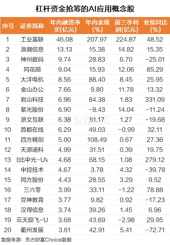 今年以来,虽然科技股热潮主要集中在硬件方向,但软件方向(AI应用)同样可圈可点。从杠杆资金角度来看,工业富联在年内被融资净买入46.08亿元,该股年内大涨207.97%。浪潮信息紧随其后,被融资净买入13.13亿元。神州数码第三位,年内被融资净买入9.74亿元。