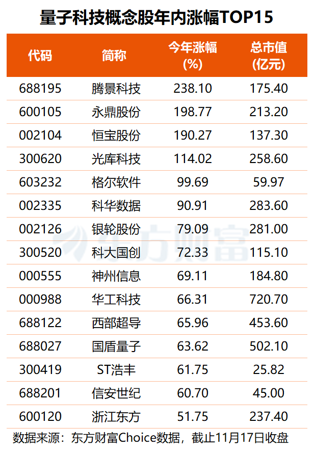 股价表现方面,近九成量子科技概念股年内股价上涨,其中,永鼎股份、腾景科技、恒宝股份、光库科技股价翻倍;西部超导、科大国创、神州信息、华工科技、西部超导、国盾量子等涨幅居前。