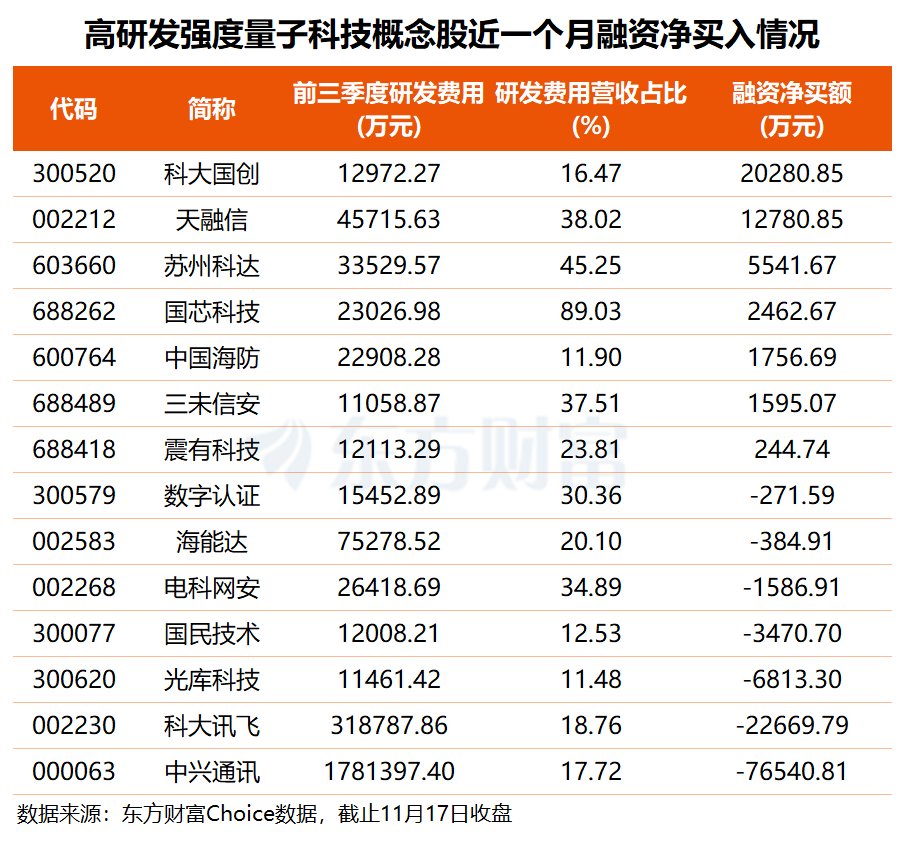 值得注意的是,上述31股中,研发费用占营收比例超10%的量子科技概念股有14只。近一个月,已有多只高研发强度个股获杠杆资金加仓。其中,科大国创、天融信分别获融资客抢筹2.03亿和1.28亿元。