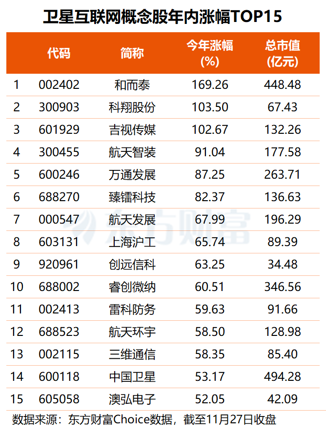 近九成卫星互联网概念股年内股价实现上涨,平均涨幅约30.09%。其中,和而泰、科翔股份、吉视传媒等3股涨幅均超一倍,航天智装、臻镭科技、航天发展、上海沪工、雷科防务等12股区间涨幅均在50%-100%之间。