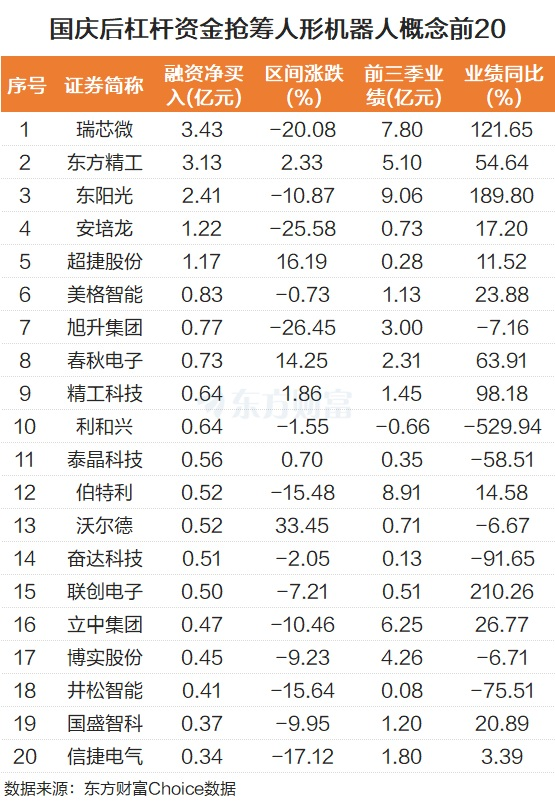 从杠杆资金角度来看,部分人形机器人概念也被积极抢筹。比如瑞芯微,国庆后融资客融资净买入3.43亿元,该股前三季度归母净利润7.8亿元,同比大增121.65%。东方精工紧随其后,融资客融资净买入3.13亿元,前三季度赚了5.1亿元,同比增54.64%。东阳光居第三位,被融资净买入2.41亿元,前三季度赚了9.06亿元,同比大增189.8%。
