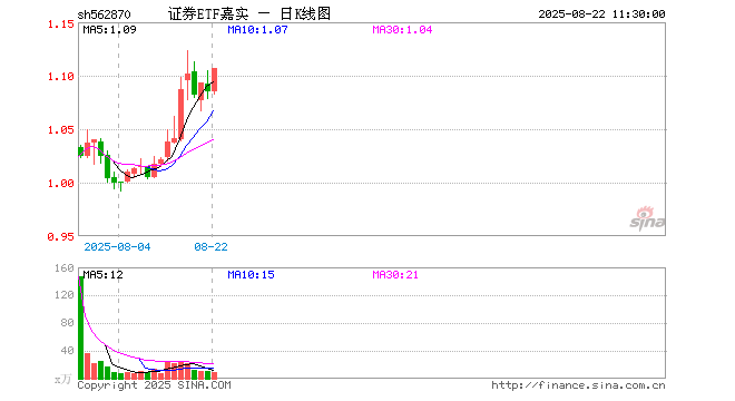 8月22日,截止午间收盘,证券ETF嘉实(562870)涨2.03%,报1.107元,成交额965.61万元。证券ETF嘉实(562870)重仓股方面,东方财富截止午盘涨3.21%,中信证券涨1.94%,国泰海通涨1.25%,华泰证券涨1.64%,招商证券涨1.39%,湘财股份涨0.95%,广发证券涨2.63%,东方证券涨1.36%,申万宏源涨0.72%,兴业证券涨1.02%。