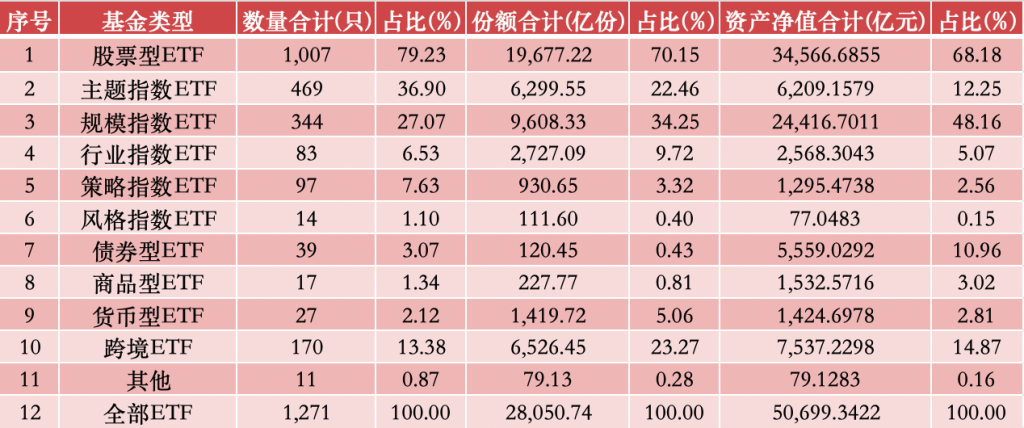 当前ETF基金数量为1271只,全市场101只ETF规模超百亿元,6只超千亿元。具体来看,在股票型ETF基金中,华泰柏瑞沪深300ETF最新规模达4128.80亿元,也是当前全市场规模最大的ETF基金;易方达沪深300ETF、华夏沪深300ETF的最新规模均超2000亿元,分别为2968.65亿元、2191.06亿元;华夏上证50ETF、南方中证500ETF、易方达创业板ETF的最新规模则均在1000亿元以上,其中易方达创业板ETF为首只规模超千亿的创业板主题ETF。