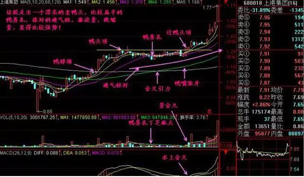 (一)、 采用5、10和60参数的价格平均线。当5日、10日均线放量上穿60日平均线后,形成鸭颈部。