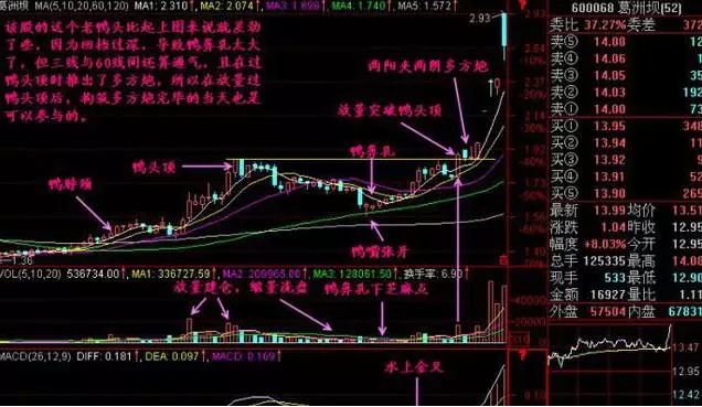 5.嘎嘎叫在E点处,这时K线冲过鸭头顶,发生阵阵鸭叫声。这时,整个老鸭头形态完成了。