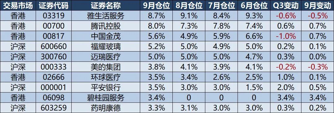 Q3主要增持:碧桂园服务(重新建仓)、阿里巴巴-W(建仓)、小米集团-W(建仓)、成都银行(重新建仓)、兴业银行(重新建仓)、中国太保H(重新建仓)、平安银行、长城汽车H(重新建仓)、华电国际电力股份H(建仓)、环球医疗、红利低波ETF、现金流ETF、腾讯控股。