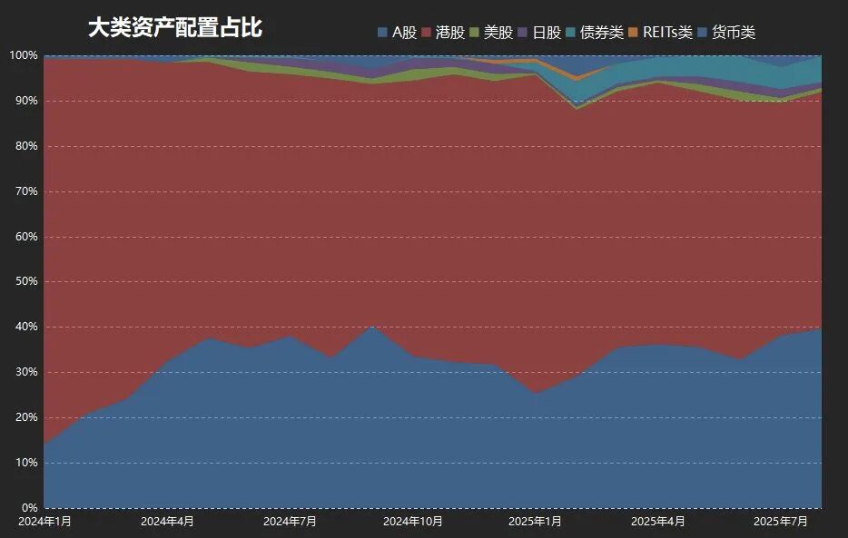 其中:A股持仓38.1%↗,港股54.9%↘,美股0.7%↘,日股0.7%↘。