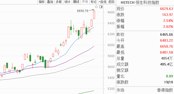 恒生科技指数今日盘中一度大涨至6650点,创下自2021年11月17日以来新高。截至发稿,该指数上涨2.62%,展现出强劲的上升势头。