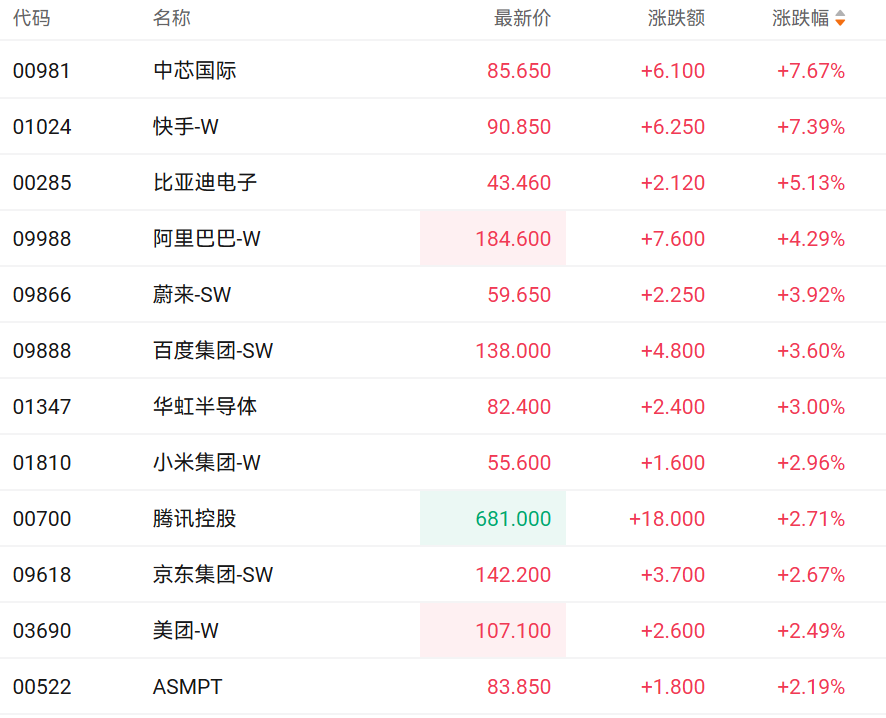 科技指数成份股表现格外抢眼,多家互联网巨头股价节节攀升。