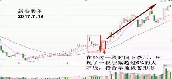 “旱地拔葱”的表现为经过连续的下跌或者是回调,当反弹或反转的走出的第一根阳线就是涨停板或是6%以上的大阳线。