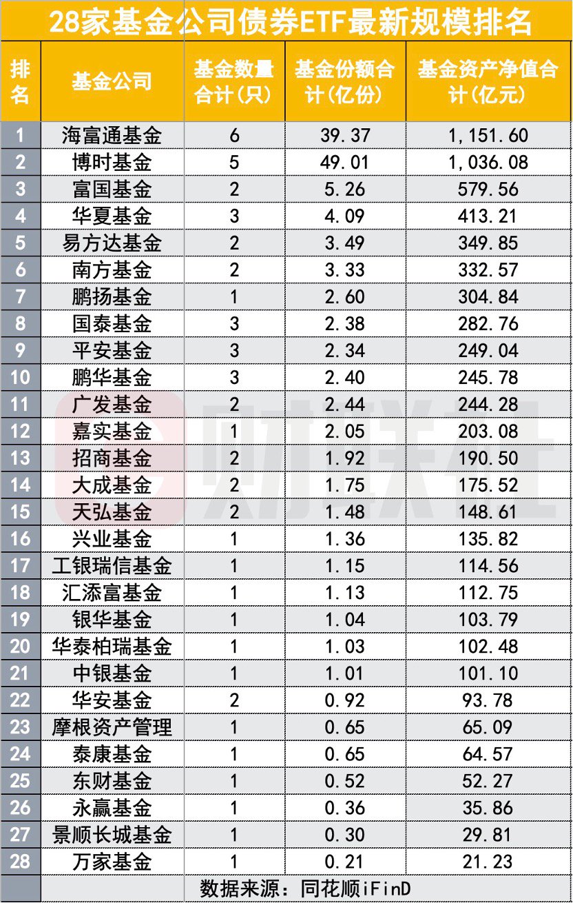 截至9月底,博时基金旗下5只债券ETF合计规模达到1036.08亿元,突破千亿元。早在7月18日,海富通基金债券ETF成为全市场首家债券ETF规模超千亿的基金公司。