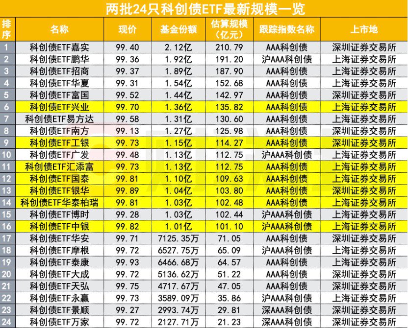刚刚上市3天的第二批科创债ETF规模增长明显,14只ETF中已有7只规模破百亿,其中,兴业科创债ETF最新规模135.82亿元,在所有科创债ETF中排名第六,工银科创债ETF和汇添富科创债ETF规模均超110亿元;此外,国泰科创债ETF、银华科创债ETF、华泰柏瑞科创债ETF以及中银科创债ETF规模超百亿元。