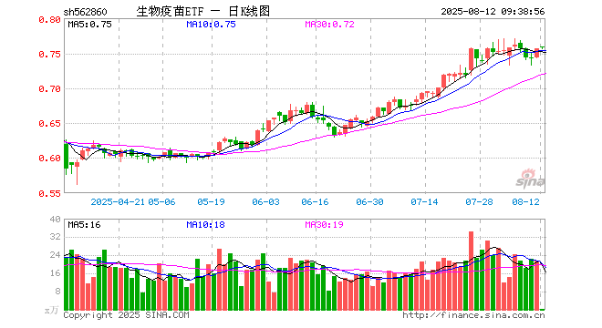 8月12日,生物疫苗ETF(562860)开盘涨0.40%,报0.759元。生物疫苗ETF(562860)重仓股方面,智飞生物开盘涨0.43%,万泰生物涨0.04%,沃森生物跌0.45%,康泰生物涨0.28%,辽宁成大涨0.00%,山东药玻跌0.04%,君实生物跌0.99%,甘李药业跌0.26%,复星医药涨5.52%,华兰生物涨0.06%。