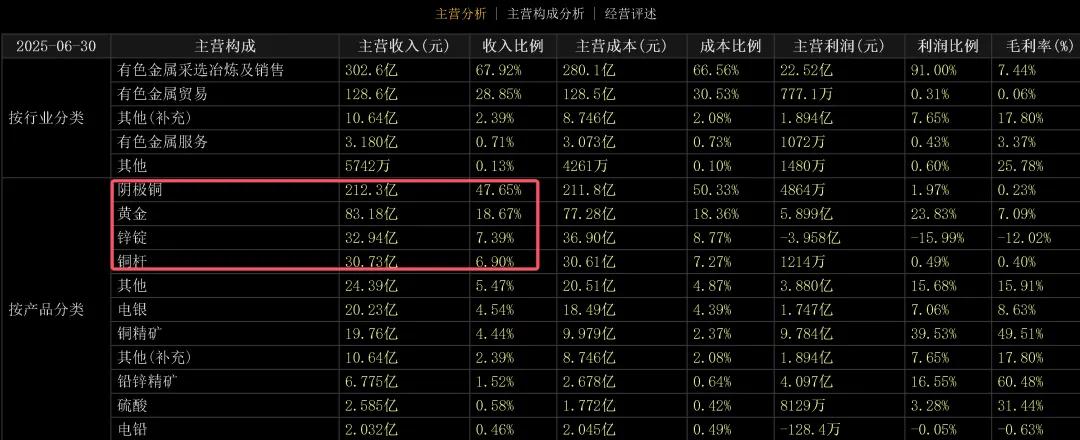 从上半年公司财报中的产品分类看,白银有色第一大业务是阴极铜,营收占比将近48%;第二大业务是黄金,营收占比将近19%;第三大业务是锌锭,营收占比超过7%;第四大业务是铜杆,营收占比将近7%。