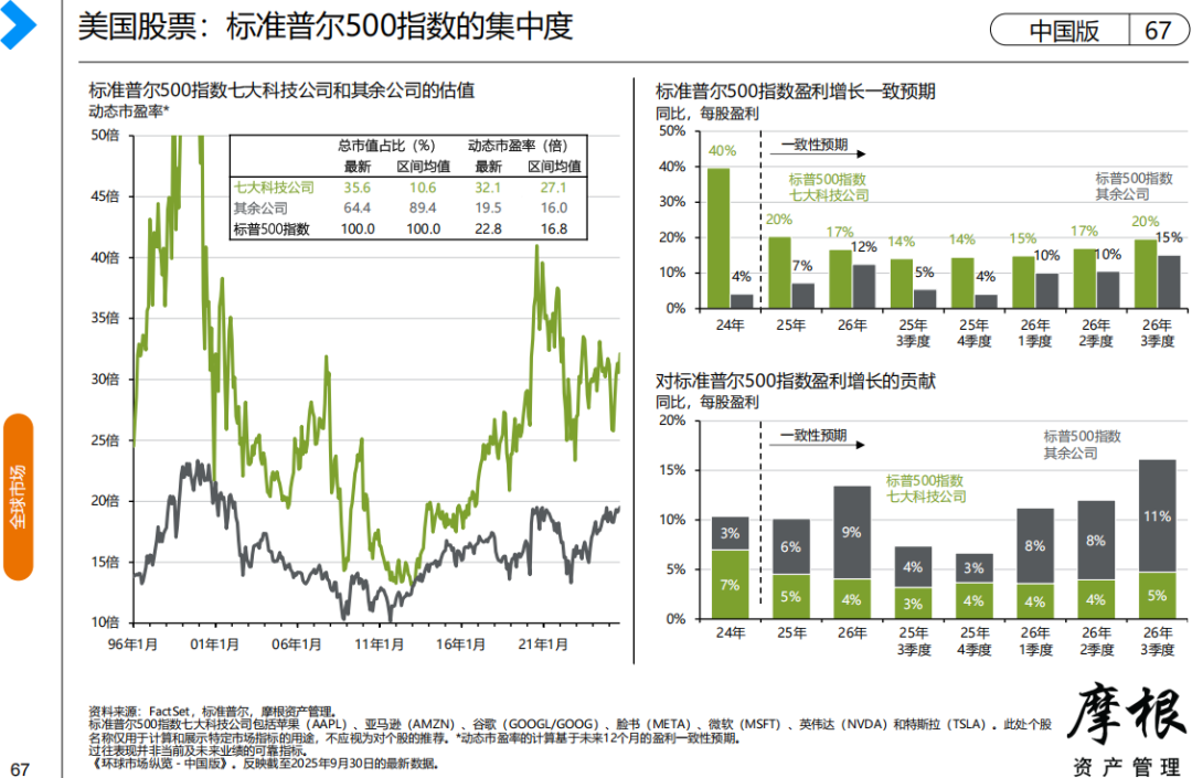 在市场结构方面,当前美股市场结构呈现明显分化:七大科技巨头估值接近历史高位,反映出投资者对“人工智能驱动增长”的强烈预期;同时,科技成长行情正加速向其他板块扩散,二三线科技股盈利增长开始提升,成为近期涨幅主力。但是,这里面可能隐含着一定的风险,规模较小的科技企业盈利容易受到意外风险的冲击,波动性或更大。