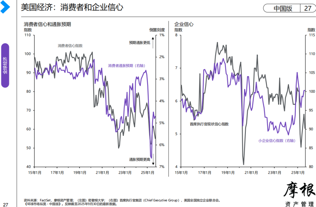但对于未来的经济增长趋势和政策走势而言,消费者和企业的预期可能起到重要作用。在4月特朗普推出对等关税后,美国消费者和企业的信心一度大幅下滑,引起资产价格剧烈波动,也导致特朗普采取缓和姿态,并且尽快推动了财政宽松措施的出台。在最近一段时间,非农就业数据走弱、美国政府停摆,造成消费者信心重新下行,叠加贸易摩擦加剧,可能会进一步损害消费者信心。在此背景下,美联储的宽松政策有可能进一步加码。
