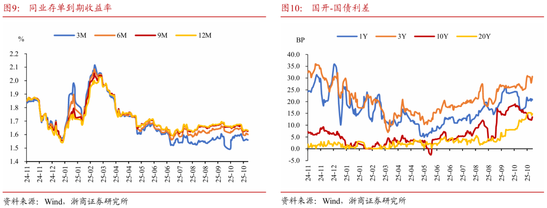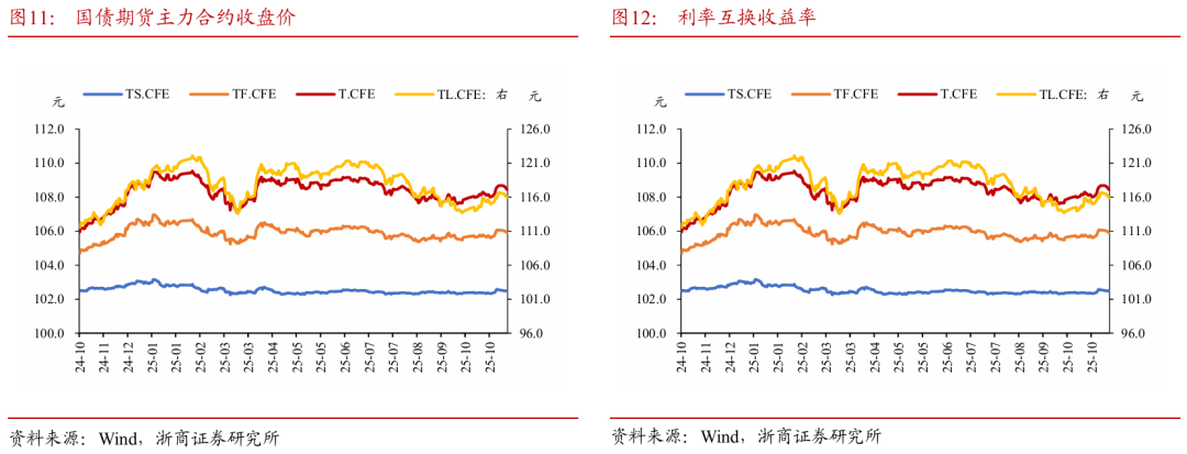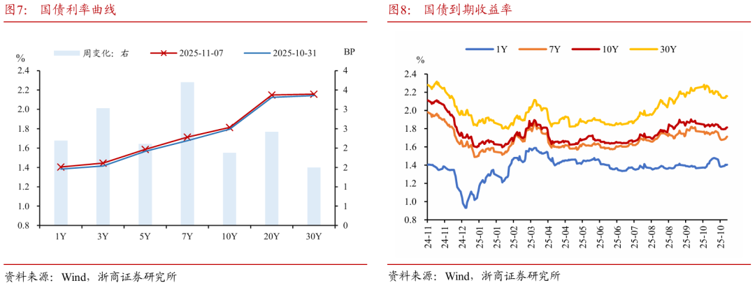 过去一周(2025年11月3日-2025年11月7日),国债收益率低位震荡后向上调整。11月3日,债市消息面相对平静,市场止盈情绪较浓,现券收益率走低后有所回升。11月4日,权益市场缩量下跌,债市延续窄幅震荡行情,尾盘阶段央行公告重启买国债引发市场出现一定波动。11月5日,全球资本市场避险情绪升温,权益资产出现大幅调整,盘初现券收益率低开后有所下行,后权益市场低开高走回暖,债市承压回调。11月6日,上证指数重回4000点,债市承压情绪走弱,现券收益率震荡走高。11月7日,早盘呈现股跌债涨跷跷板走势,出口数据超预期转负对债市形成一定提振,午后股债均有所转弱。截至收盘,10年国债活跃券收报1.8060%,30年国债活跃券收报2.1560%。
