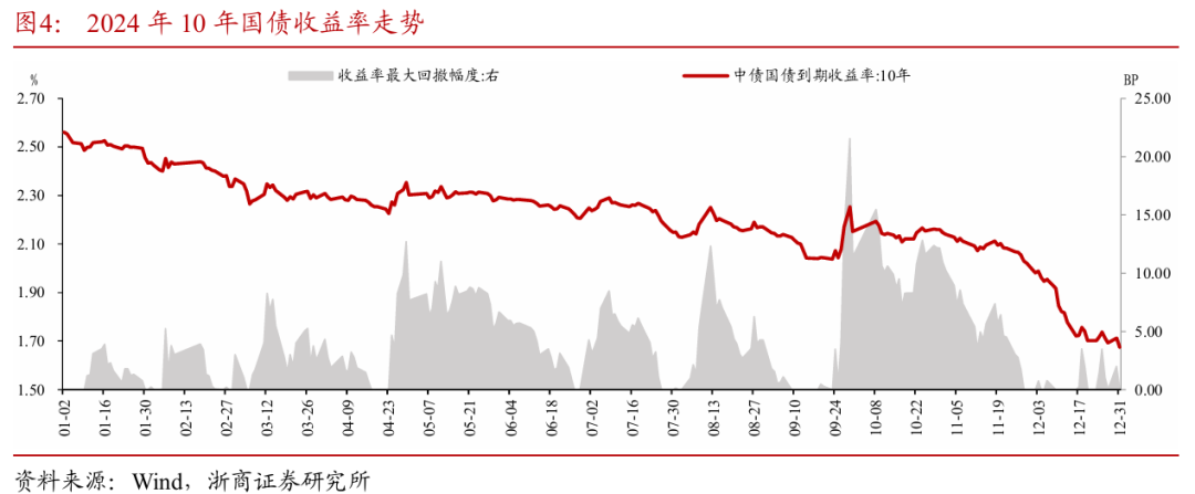 2024年债市——“债持不炒、每调买机”。2024年债市全年呈现大牛市行情,10年国债收益率由2023年末的2.56%下行至2024年末的1.68%,累计下行幅度达88BP。从波段回撤的角度来看,2024年国债收益率单边下行的趋势相对鲜明,期间最大回调发生在2024年9月末,最大回调幅度21.53BP。