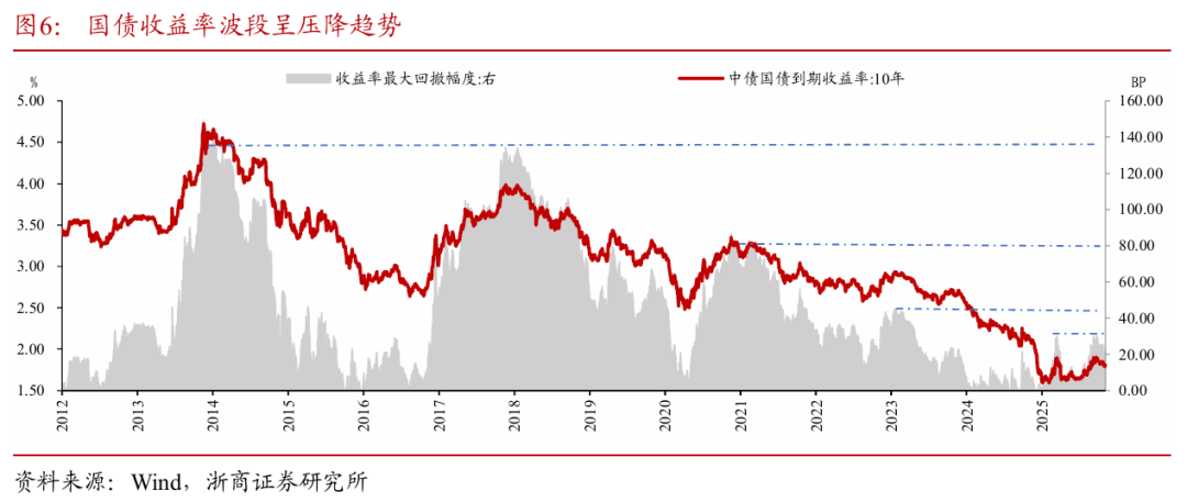 站在大周期角度审视债券市场,我们可以看到其存在波段与趋势交替的行情特征。2022年1月至2023年1月,债券市场整体处于波段期,10年国债收益率在2.55%至2.95%之间宽幅震荡,并未形成较为鲜明的上升或下行趋势。2023年2月至2025年1月为趋势期,期间虽不乏20BP左右的行情调整,但收益率整体下行的趋势较为明显,收益率最高下行幅度超过130BP。2025年2月以来,债市则再度由趋势期转为波段期,此前收益率持续下行的趋势出现中断迹象,甚至债券收益率呈现一定无序波动状态。
