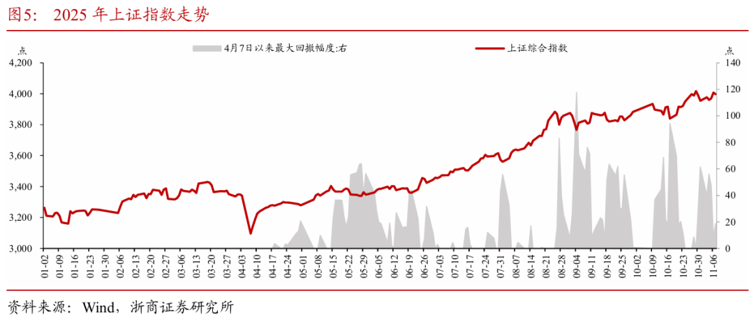 2025年股市——信心回暖,慢牛初成。4月7日以来,权益市场走出极具韧性的上涨行情。截至11月7日,上证指数收报3997.56点,较4月7日低点累计上涨29.10%,期间最大回撤发生在9月初,上证指数较此前高位回落约117点。
