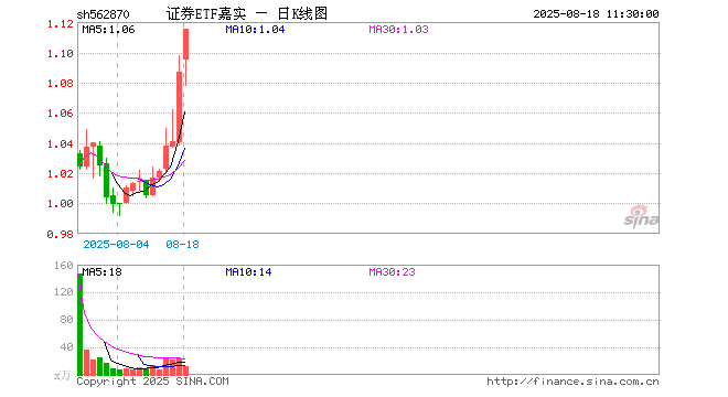 8月18日,截止午间收盘,证券ETF嘉实(562870)涨2.58%,报1.115元,成交额1415.11万元。证券ETF嘉实(562870)重仓股方面,东方财富截止午盘涨5.98%,中信证券涨3.34%,国泰海通涨1.55%,华泰证券涨0.60%,招商证券涨2.08%,湘财股份涨9.00%,广发证券涨0.00%,东方证券涨1.74%,申万宏源涨1.62%,兴业证券涨2.03%。