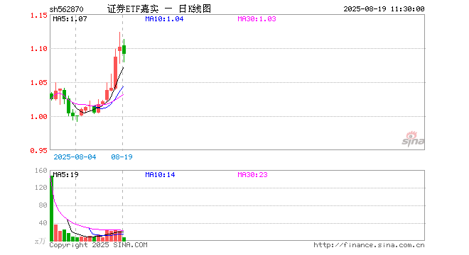 8月19日,截止午间收盘,证券ETF嘉实(562870)跌1.00%,报1.091元,成交额717.90万元。证券ETF嘉实(562870)重仓股方面,东方财富截止午盘跌1.47%,中信证券跌1.42%,国泰海通跌0.77%,华泰证券涨0.00%,招商证券跌0.85%,湘财股份跌0.80%,广发证券跌0.77%,东方证券跌0.08%,申万宏源跌0.90%,兴业证券跌0.72%。