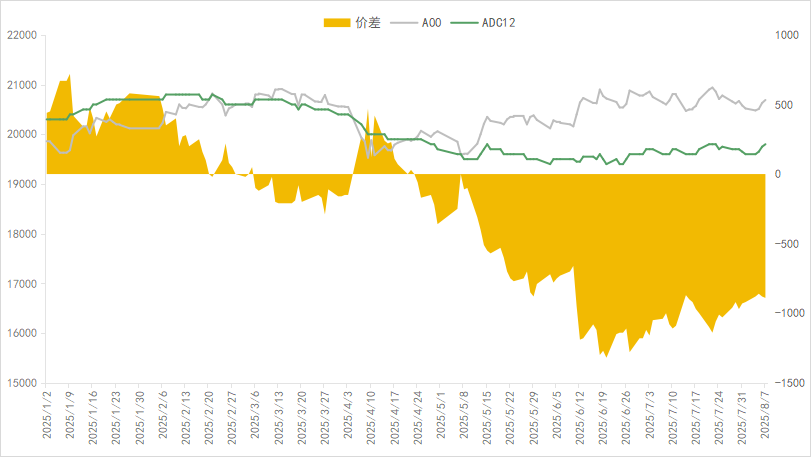 据富宝有色数据测算,截止2025年8月7日,华东地区ADC12成本为19625元/吨,相较2025年7月31日成本值上涨222元/吨;华南地区ADC12成本为19933元/吨,较2025年7月31日成本值上涨339元/吨。